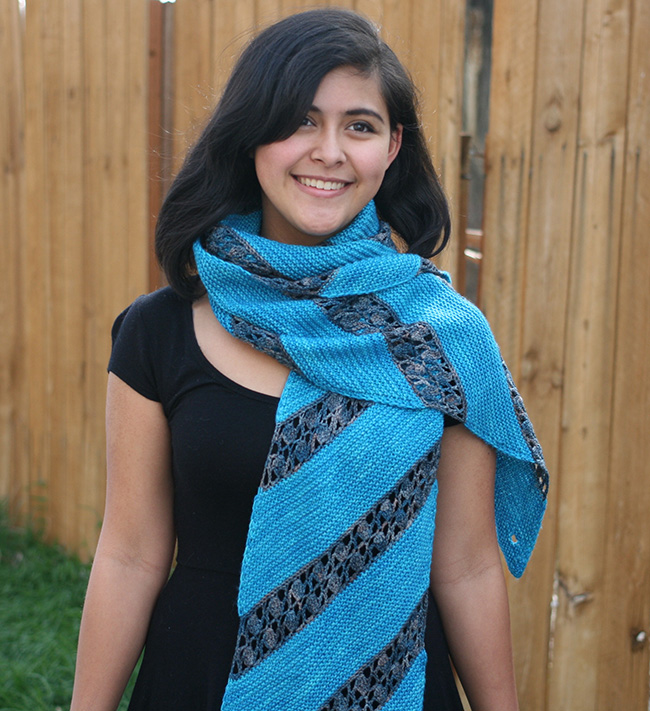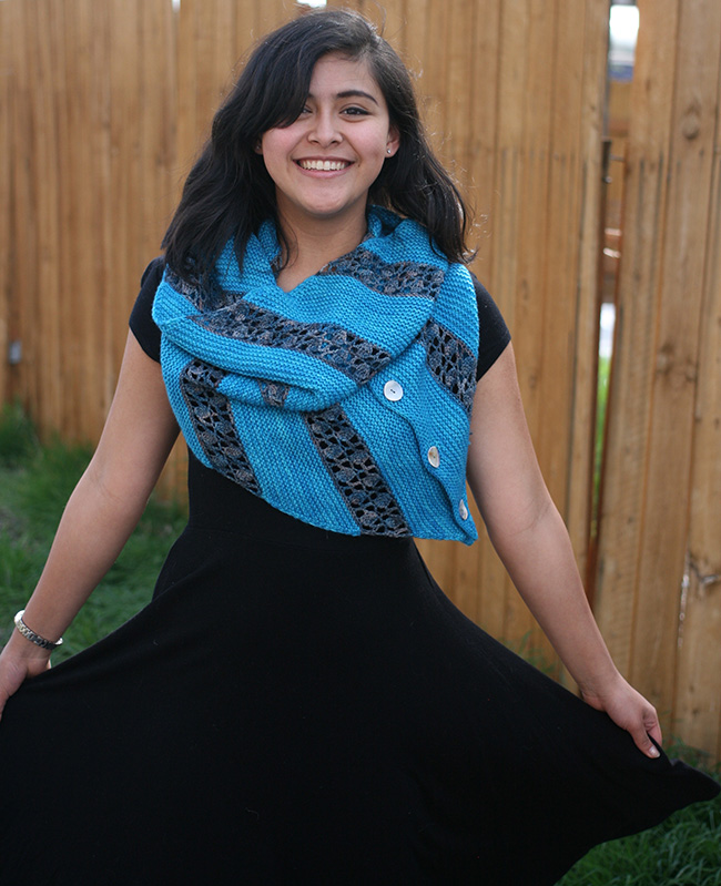 Worked on the bias, this convertible scarf/cowl alternates knit garter stitch stripes in a larger yarn with crocheted lace stripes in a finer yarn for a study in contrast of texture, weight, drape, and color. A slipped stitch edge gives it a clean selvage, and it finishes with a stripe that has buttonholes, so you can easily button it closed to form a cowl.