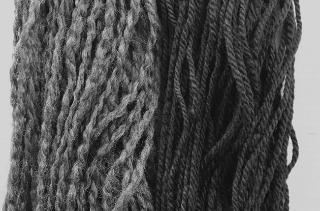 Take a look at the two swatches above. The swatch on the left is Cascade Ecological Wool, a “fuzzy” yarn. This yarn is made from a pooled wool comprised of many different breeds or cross-breeds, whose wool shares similar characteristics to achieve a uniform product. This wool is has a lot of crimp and spun with a relatively low degree of twist, giving it a soft look and hand that causes the pattern to recede into the cloth.