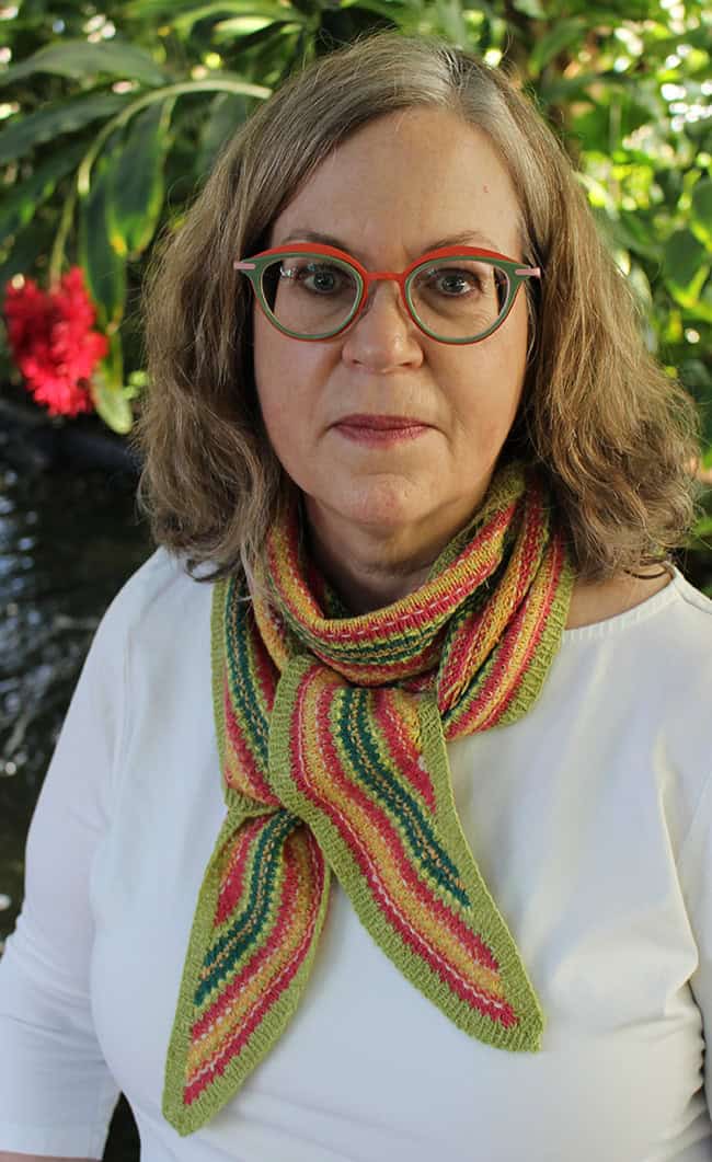 The sample uses a lightweight fingering blend of wool and cotton with a very light twist. Using a variety of yarns with different textures will add interest to your project, but try to keep them about the same weight. Use the needle size recommended for the yarn you choose.