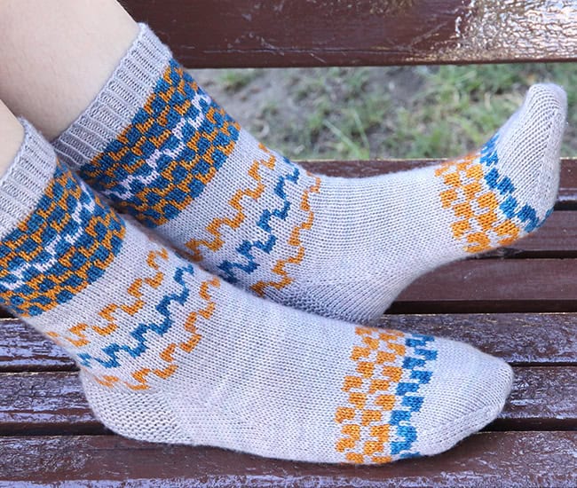 For best results, use a wool/nylon blend with a plied construction to ensure durability and stability. For CC I recommended semisolid colors. This design is an efficient way to use up mini-skeins or leftover yarn. Each repeat of the main colorwork motif (6 stitches over 6 rounds) uses about 0.9–1.0 g of both the Main Color (MC) and the Contrast Color (CC).