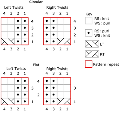 Left Purl Twist (LPT): Purl the second st on the left needle through the back loop, knit the first st through the front loop, slip both sts from needle.