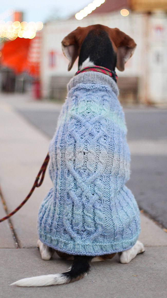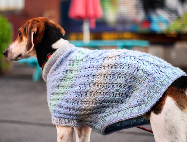 Construction method: This sweater is knit seamlessly from the top down (neck to approximately the base of the tail). It begins with the collar, which is knitted to double the length of your preference and cuffed. Then, increases for the chest are worked before dividing the piece to create the holes for the front legs. First, the back is worked even while the underside stitches are placed on hold. After the correct length is worked, stitches from the underside are returned to the needle and worked for the same length. Then, the underside stitches and back stitches are joined together again and worked in the round briefly, before once again placing the belly stitches on a hold and continuing the back stitches flat, gradually working decreases. After the correct length is achieved, stitches are picked up along the decreased edges and belly stitches and worked in the round one final time to create the ribbed edge. Finally, stitches are picked up from around each front leg hole and worked in ribbing to create the sleeves. The bottom hem and sleeves are both finished with a tidy 2-stitch I-cord bind-off.
