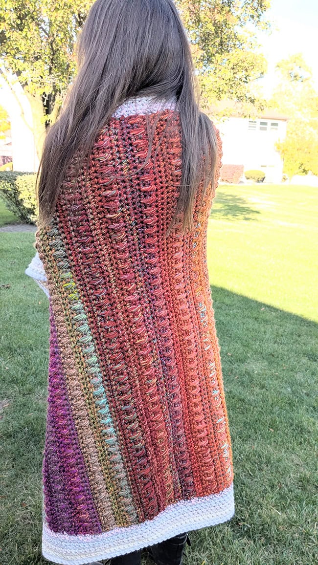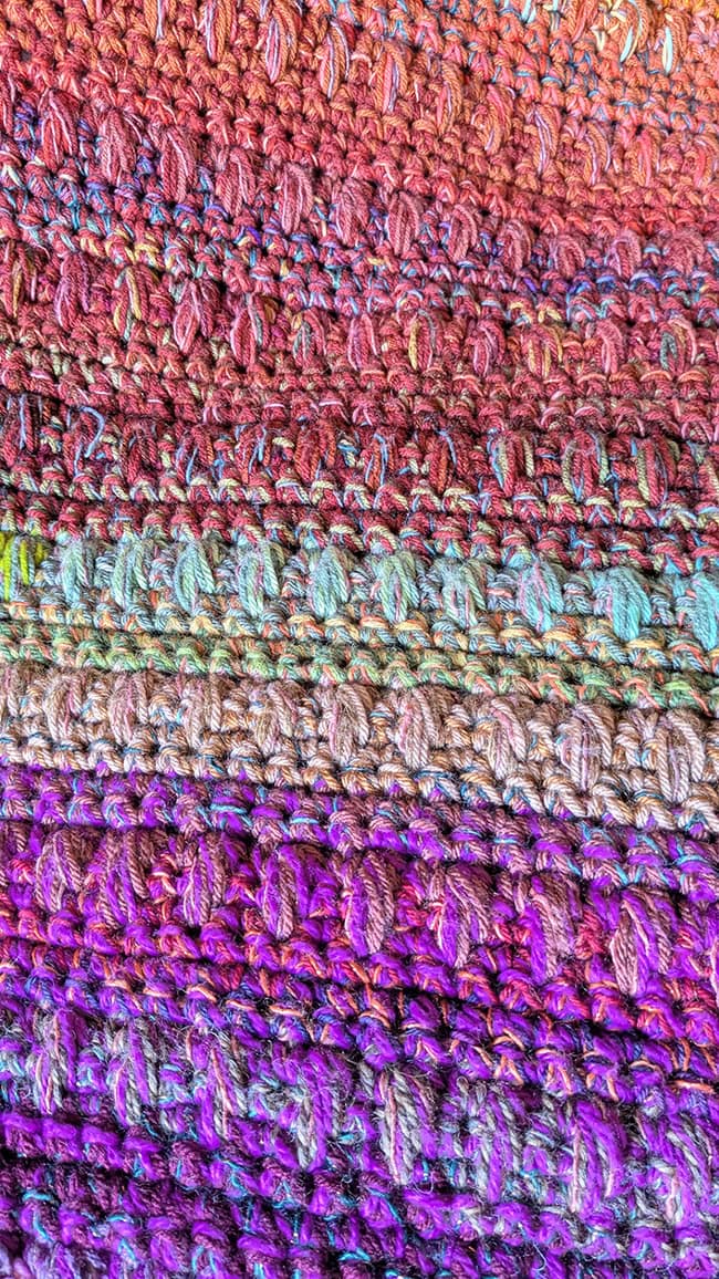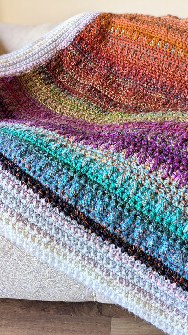 The caramel stitch is a cluster spike stitch with a gorgeous, luxurious appearance. Though the stitch definition is muted slightly when you hold so many strands together, the spiked stitches add a fun pop of texture and interest to all the color changes featured in this blanket! If you have yarn in a color or colors that you don't necessarily love anymore, blending it with others can give it new life.