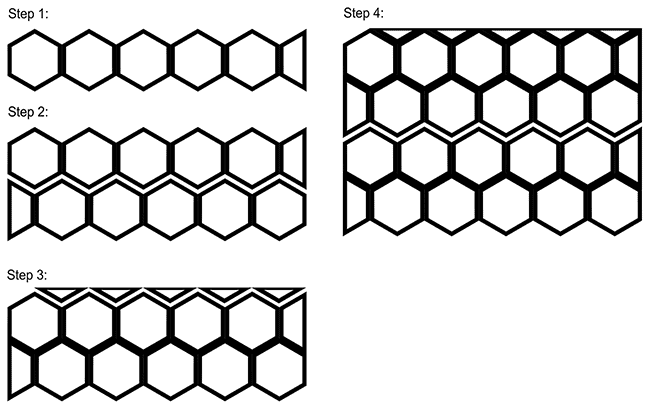 Pin each Hexagon at each of its six corners, with the top and bottom edges aligned to the tape guidelines, if using them.