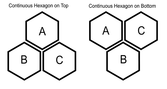 Step 6: The next purl bumps on the hexagons should be the ktbls at each corner. If the continuous hexagon is on top, work as follows: pass the yarn through the bumps on B and A, working from bottom to top; pass the yarn through the bumps on B and C, working from right to left; pass the yarn through A and B, working from top to bottom; and finally pass the yarn through C and A, working from bottom to top. If the continuous hexagon is on the bottom, work as follows: pass the yarn through the bumps on B and A, working from bottom to top; pass the yarn through the bumps on B and C, working from right to left; then pass the yarn through the bumps on C and A, working from right to left; and finally pass the yarn through the bumps on B and A, working from bottom to top. The yarn should now be ready to work the next seam segment in the strip.