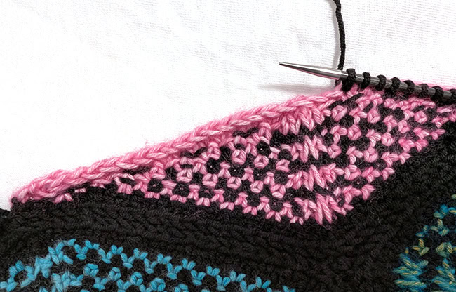With right-side facing, beginning at the bottom-right corner of the blanket, using US #4/3.5mm needles for working flat and CC, pick up and knit 25 stitches from the first short-side border, picking up one stitch from each garter ridge and placing a marker; pick up and knit 40 stitches along each Half-Hexagon, picking up under both stitches from the slip-stitch edge and placing a marker; then pick up and knit 25 stitches along each Hexagon, picking up from both legs of the bound-off stitches and placing a marker; then 2 stitches from the edge of the Hexagon-Edge, placing a marker; and then finally 16 stitches from the other short-side border, picking up one stitch from each garter ridge.