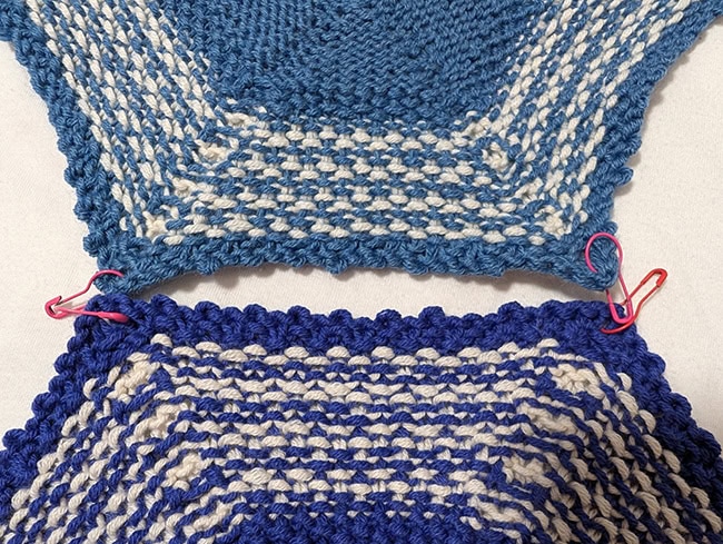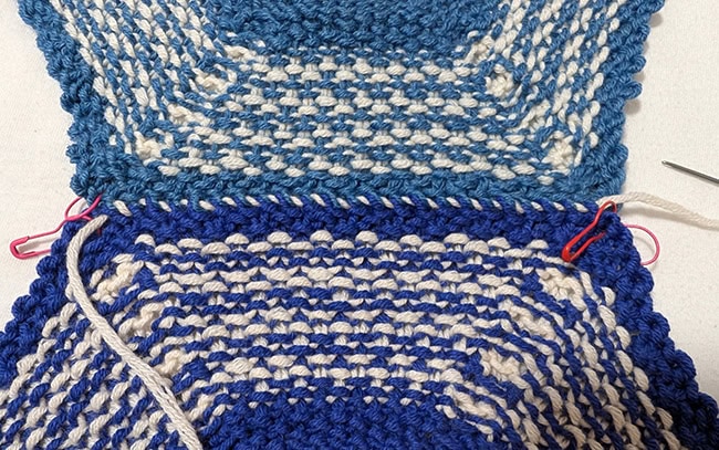 Step 1: Place removable stitch markers in the final ktbl at the ends of each strip. These are easier to place looking at the right-side of each component.