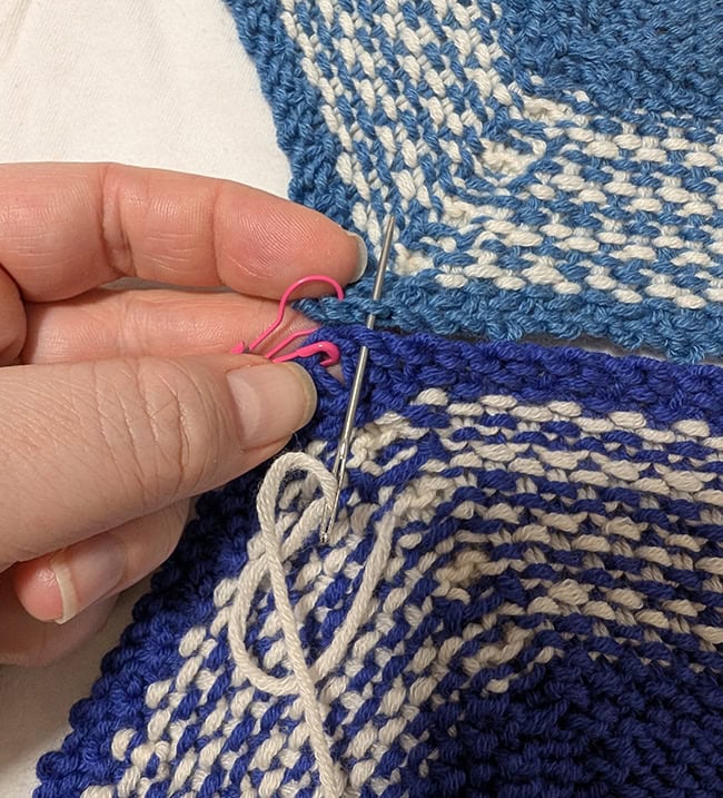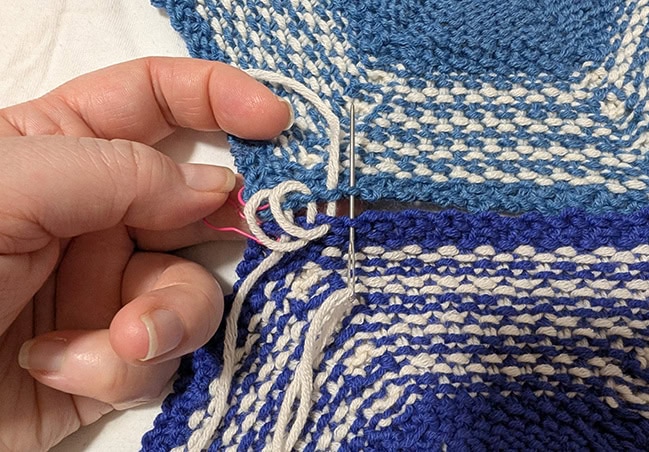 Step 5: Repeat until all 23 sets of purl bumps have been sewn together, working left to right across the seam. Secure ends of yarn.