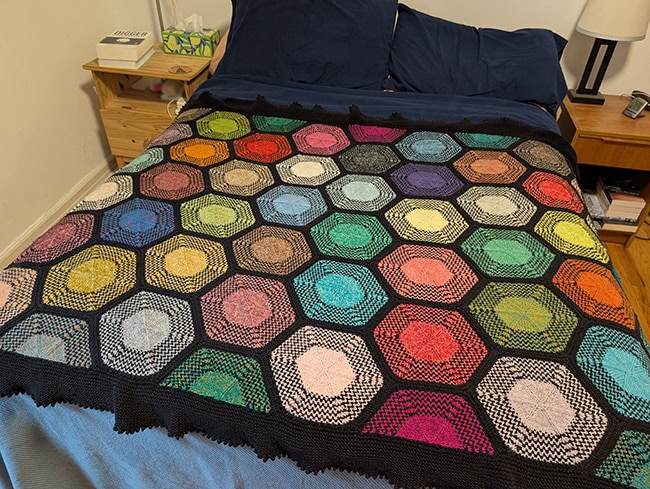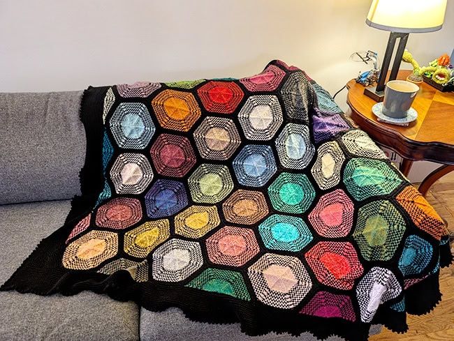 The blanket uses the main color for the linen-stitch increase rows and black contrast color for the bind-off of each component and the border. It was designed to use almost every gram of 49 colors in the Scheepjes Stone Washed/River Washed Color Pack; with each hexagon taking almost a full 10-gram mini-skein. The yarn order was random; the mini-skeins went into a project bag, and it was shaken up and the next color picked was the next color used. I kept the stack of components in order as I finished, soaked and blocked them, letting those original selections guide the look of the final blanket.