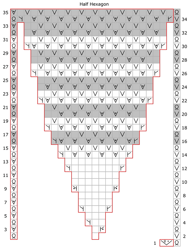 The total stitch count will be 25 from the first short-side border and short-row wedge plus a multiple of 40 stitches for each Half-Hexagon, plus a multiple of 25 stitches for each Hexagon; plus 2 stitches for the Hexagon-edge plus 16 stitches from the second short-side border. For a blanket with four Hexagons and four Half-Hexagons along each long side, the total stitch count will be 303 stitches.