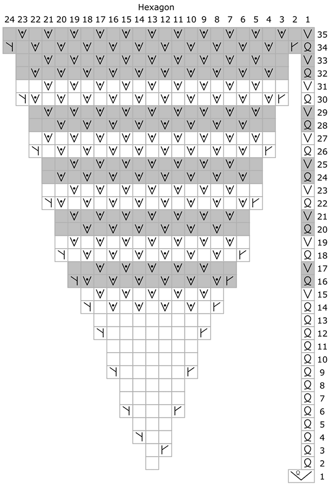 The total stitch count will be a multiple of 37 plus 24; for a blanket with five Hexagon-Edges along each short edge, there will be 209 stitches total. Stitch counts are provided based on this size.