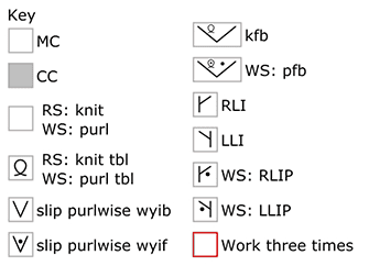 Note: Place a stitch marker on row 1 after the 18th stitch, to mark the center twisted stitch; on the right side, the stitch before the marker will always be a ktbl. On the wrong side, the stitch after the marker will always be worked as a slp wyif.