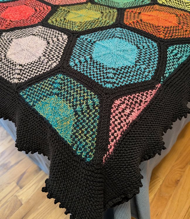 The sample shown is made of 40 Hexagons, 8 Half-Hexagons on the long sides, and 10 Hexagon-Edges on the short sides. The knit-on garter-stitch border adds 3.5 in / 9 cm to each side.