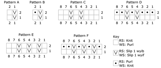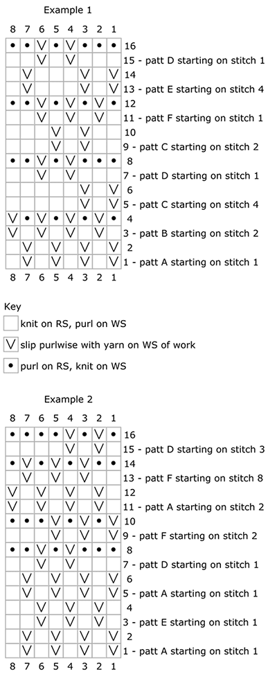 - You can follow any stitch pattern with any other stitch pattern, but to make sure that you are slipping different stitches, you may need to start the new pattern on a stitch other than stitch 1 of the chart. You can start on any stitch of the chart as long as the slipped stitches are placed above stitches which were NOT slipped in the previous 2 rows. You can move the stitch patterns around so that you get a result that you like. See the Example Charts below for an example of a possible pattern sequence.