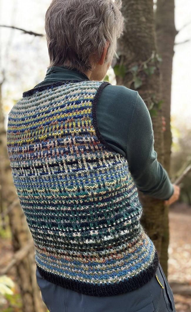 Note: If you want the left and right backs to match, make sure you have enough of your chosen yarns to work both sides, and set each yarn aside as you finish working it on the right back so that it is easily available for working the left back.