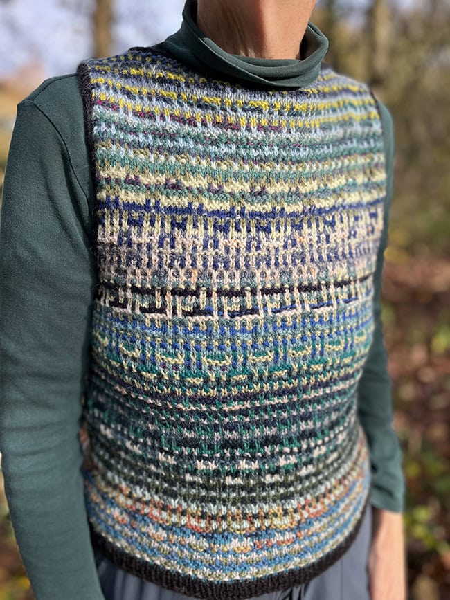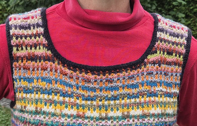 The pattern is styled for a square(-ish) neck or a boat neck. The square neck sample is knitted in every available color, and the boat neck version is knitted using scraps of mostly greens, blues and greys.