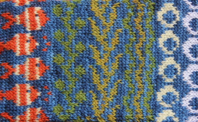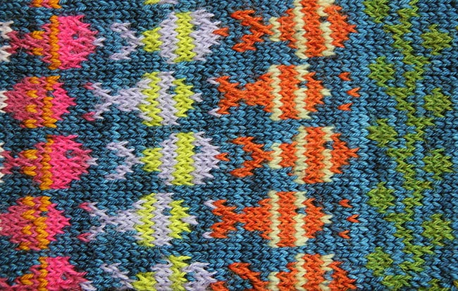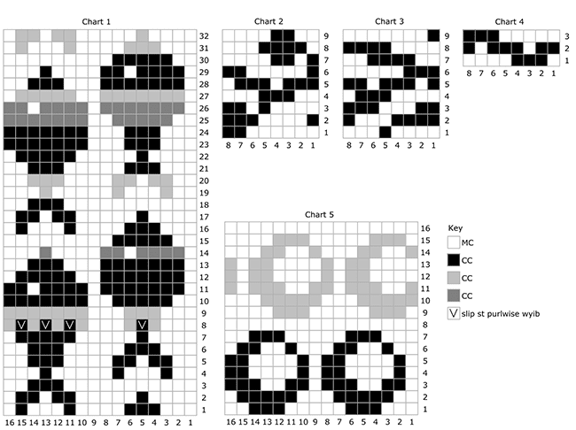 Note: In Chart 1 (the fish), I've suggested where slipped stitches can be added to make the colour stripes even more dynamic. Shift the placement of the slipped-stitch rows and stripes, or vary the stripe width as you like, to create even more variations.