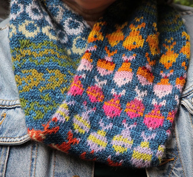 Construction method: The cowl starts off with a crochet provisional cast on. It is then worked in the round in stranded colorwork to form a tube. When finished, the two ends of the tube are grafted together invisibly.
