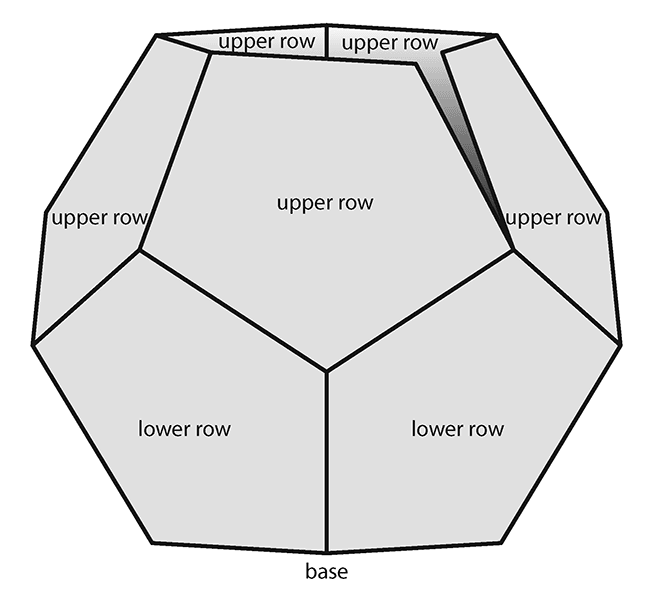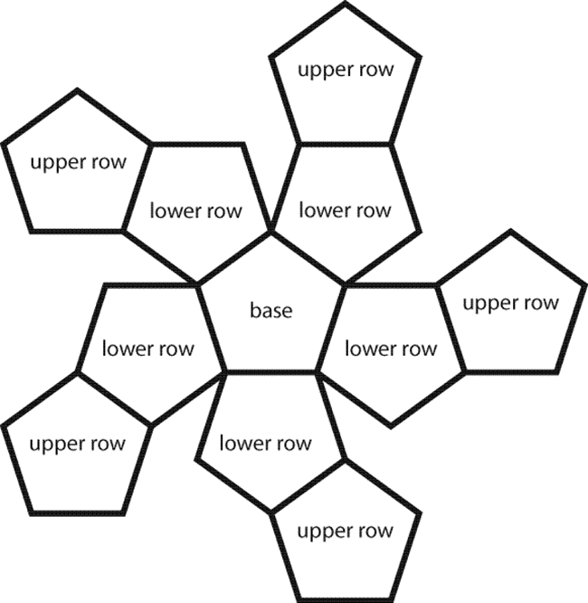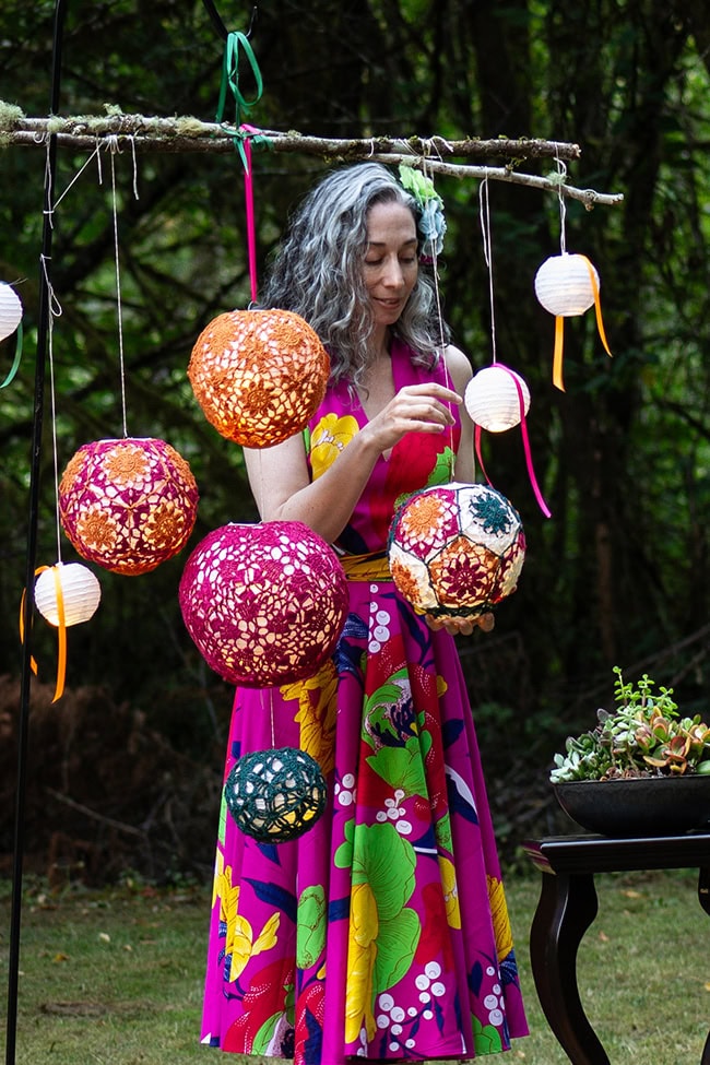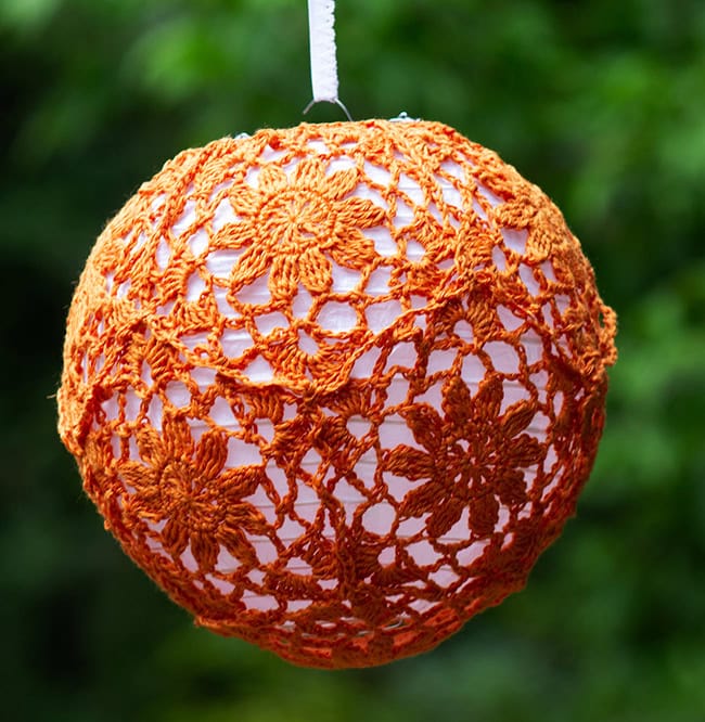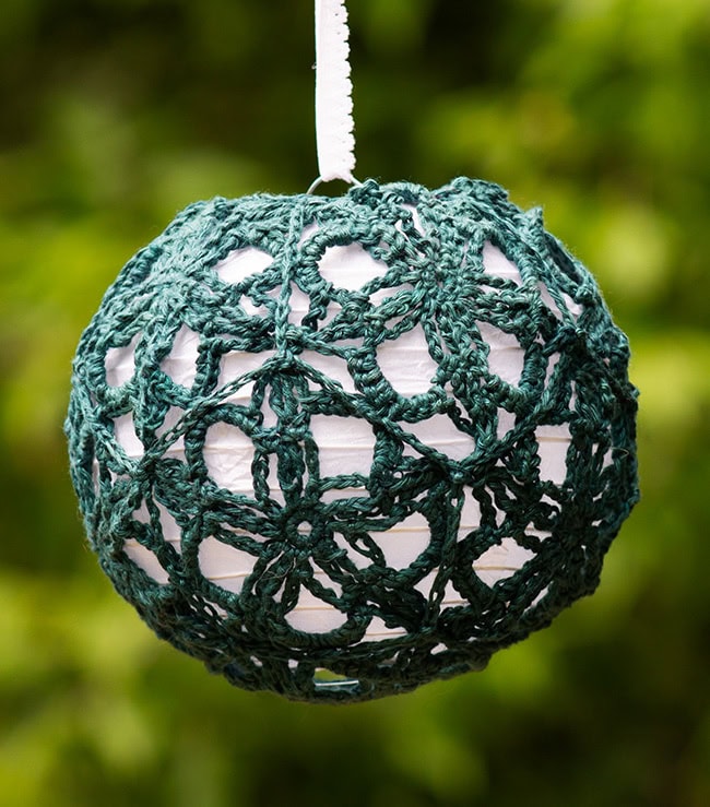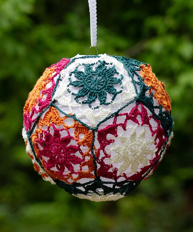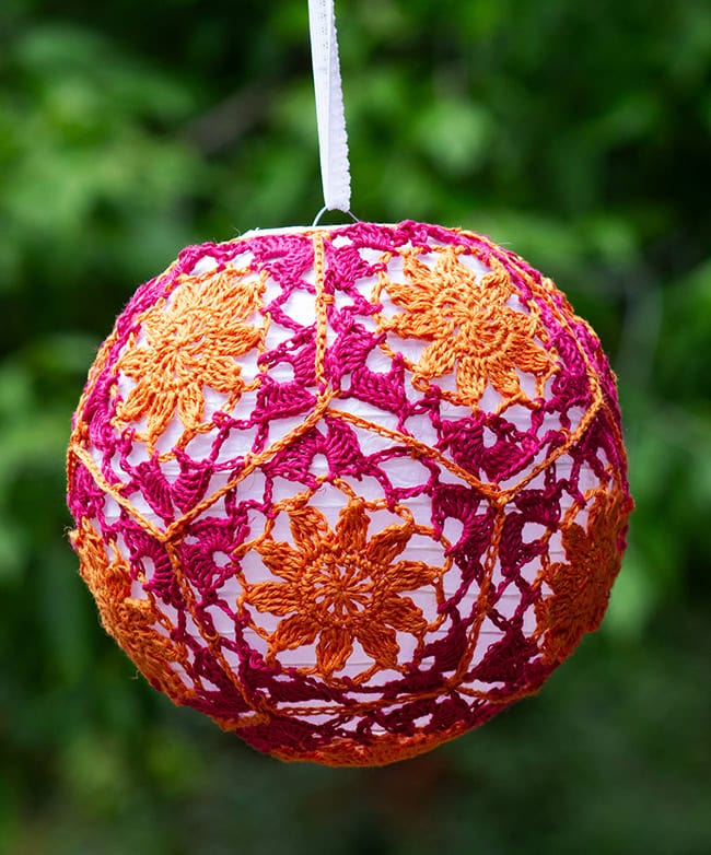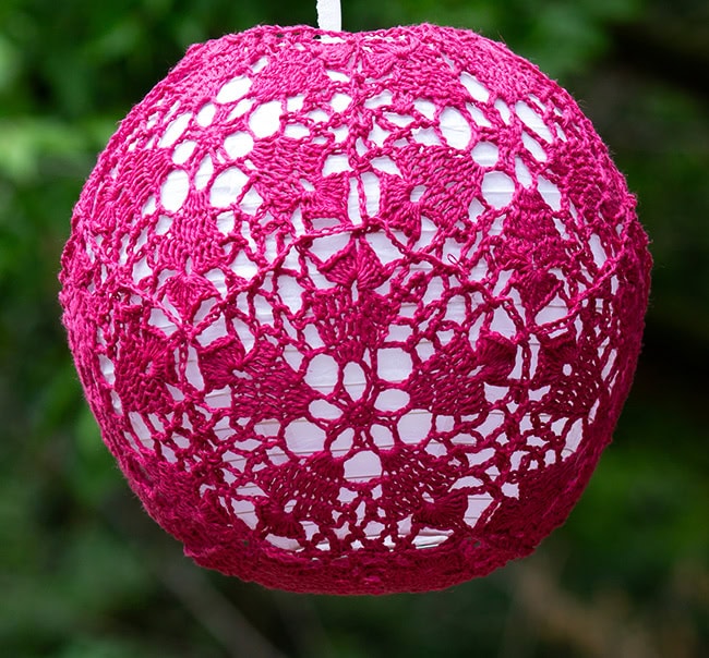 Construction method: Each lantern requires 11 pentagons to form a dodecahedron with an open top. The motifs are worked individually then ironed flat for assembly. The pieces are then crocheted together, leaving an opening between two motifs on the top row. The lantern is inserted, the last edge closed, then the top edge is finished to ensure a secure fit.