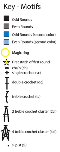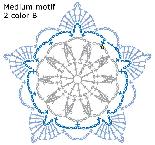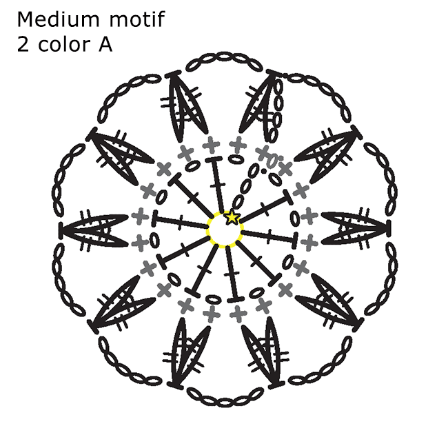 Work 11 Medium 2-color Motifs, working the first 3 rounds with C2 and using C1 for the last rounds. Join with C2.