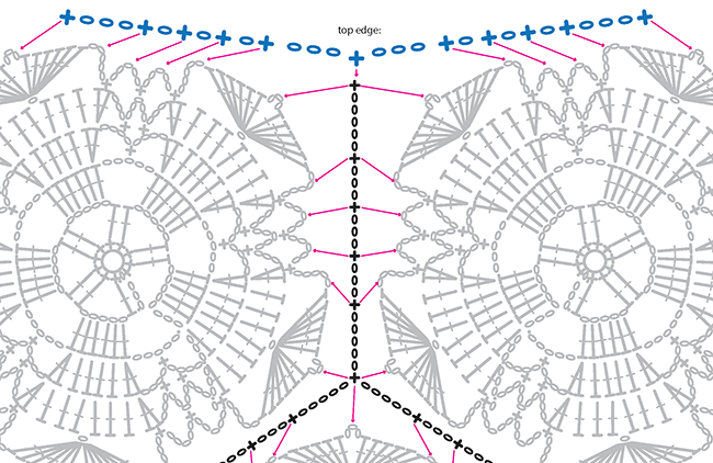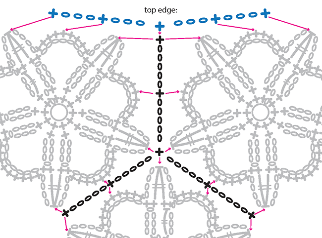 Top edge: Ch 1, *sc into intersection sc, ch 5, sc into ch-7 space, ch 5, sc into intersection sc; rep from * around ending with a sl into first sc. Fasten off. Weave in ends.