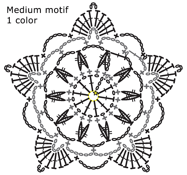 One Medium motif: 4.75 inches / 12 cm across between the widest points