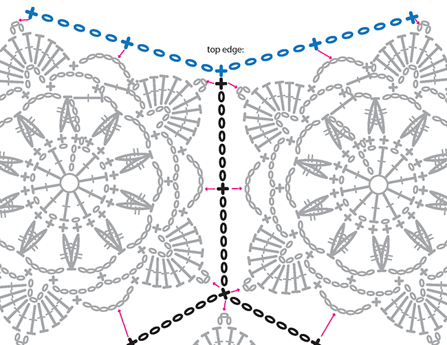 Motif to motif: Sc adjacent ch-3 spaces tog, ch 5, sc ch-5 spaces tog, (ch 3, sc next ch-5 space tog) 3 times, ch 5, sc next ch-3 spaces tog. Fasten off. Weave in all ends