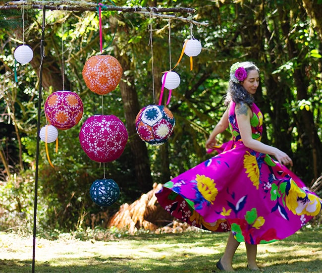 Each lantern is comprised of eleven pentagons assembled over a paper lantern. There are three diameters: 10 inches/ 25.5 cm, 8 inches / 20 cm, and 6 inches / 15 cm.