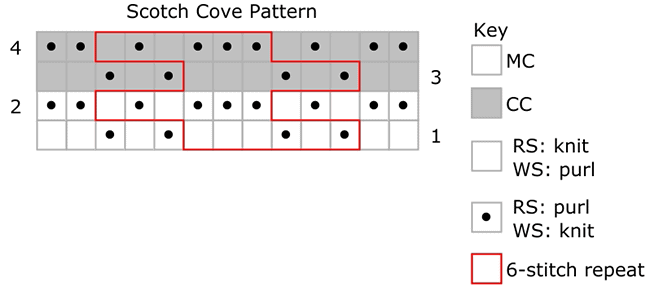 Adjusting length: Cast on a multiple of 6 stitches plus 1. Adjust the width by changing the number of pattern repeats. Each pattern repeat adds approximately 1 inch/2.5 cm. End with row 2 of the pattern and enough MC yarn to work the bind off.