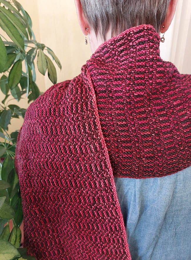 This pattern is written for two skeins of superwash merino yarn, but any fingering-weight wool or wool blend with at least two plies would work well as a substitute. There's a lot of latitude for colour choices as well. To achieve the rich subtle effect of the scarf as shown, find a gradient that you love and then combine it with a semi-solid or tonal CC that is similar in hue to one end of the gradient. In this case, the pink-to-brown gradient contrasts with the brown of the CC at one end and melds with it at the other. Choosing colour ways that are similar in value (both light, both medium, or both dark) also helps build a quiet but complex fabric. An easy way to check the value of your colours is to take a photo and then change it to greyscale to see if they blend together. If you don't have a gradient, try two semi-solids or tonals, in low contrast for a subtle look or high contrast for more of a pop.