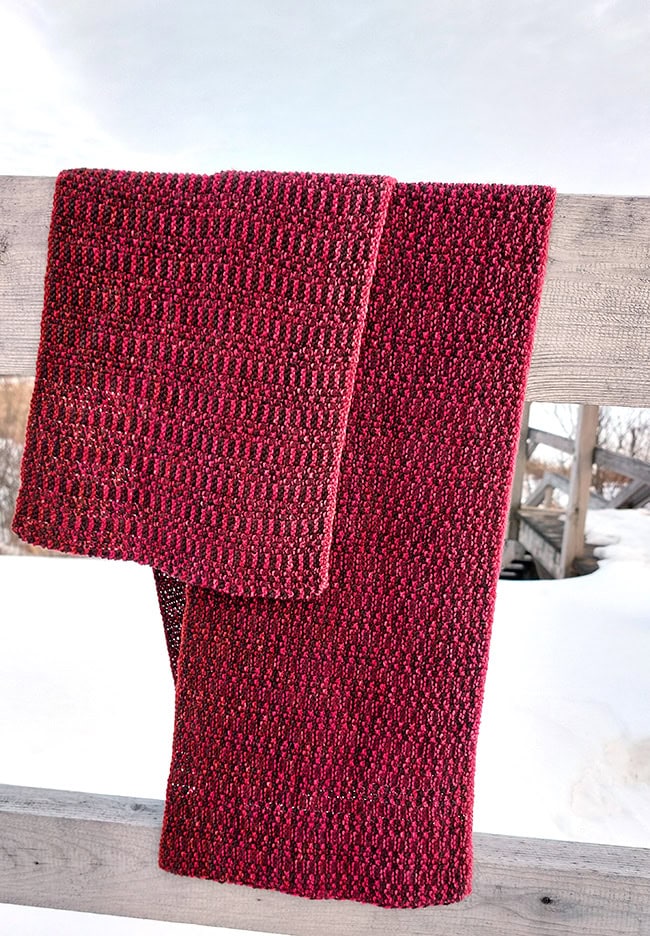 This scarf is based on a six-stitch repeat, and inspired by Sequence knitting: Simple methods for creating complex fabrics by Cecelia Campochiaro. Knitting sequences feels good. The simple repeats flow through my fingers and quiet my busy mind; I find myself paying attention to the yarn, while setting my brain free to float. Picking up a project with such long rows feels like an invitation to slow down and sit for a while, to settle into a social interaction or relax into a sunbeam with my cat. The long rows in this scarf are a commitment to spend more time in these moments.