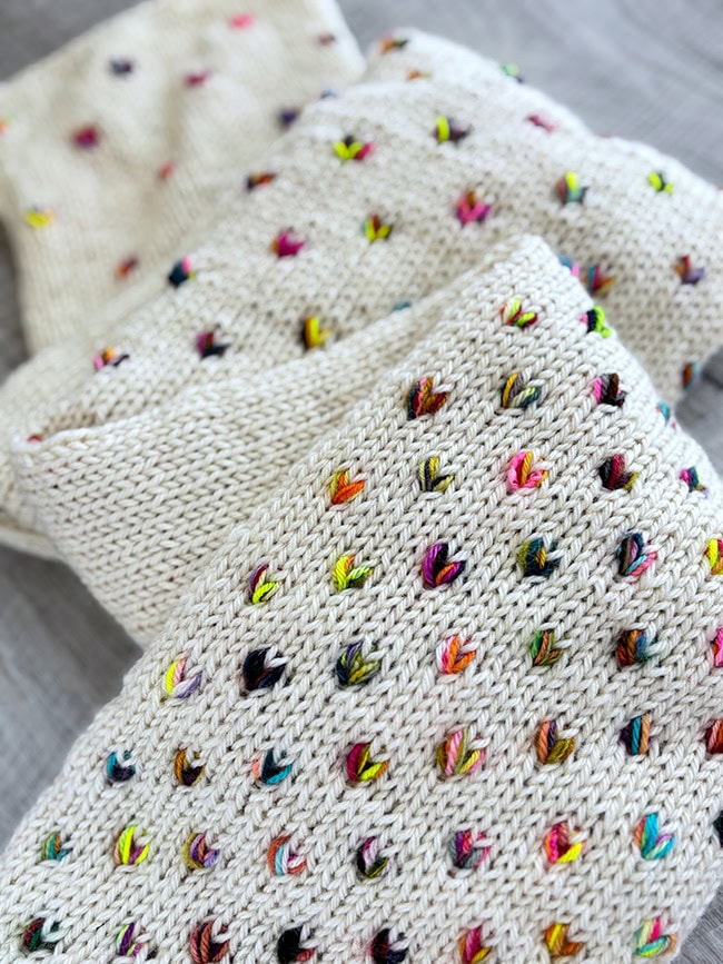 - 3 strands of fingering/sock weight, 2 strands of worsted weight and 1 strand of lace weight - K thrum - Working a Thrummed stitch: