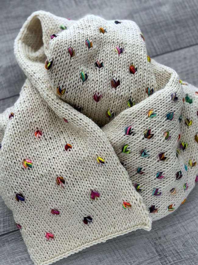 So, collect your scraps, your leftover yarn from your favorite sweaters or pairs of socks, the trimmed ends, the oddments, or the 20-gram minis you've been saving and create a cozy, squishy scarf, full of memories and stories of past projects.