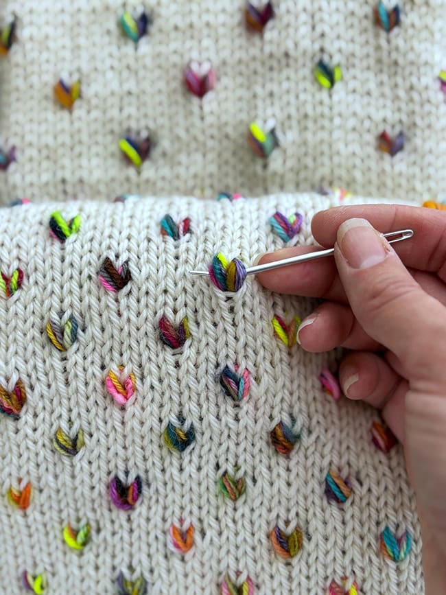 Check over your scarf for any thrums that may have disappeared, been pulled too tight, or that have partially disappeared. Take your darning needle and gently slide it under the thrum strands and give it a little wiggle (see photo below). You can also just use your hands and give it a tiny pull.